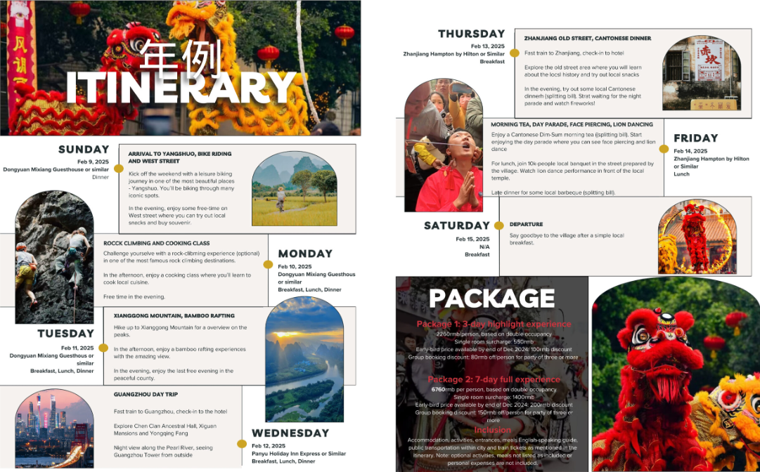 Discover the enchantment of Chinese New Year on a meticulously planned excursion that blends cultural immersion, scenic landscapes, and traditional celebrations. Experience the spirit of the Lunar New Year in Southern China as you travel through the mystical Yangshuo environment and the lively festivities in the old cities of Guangdong!