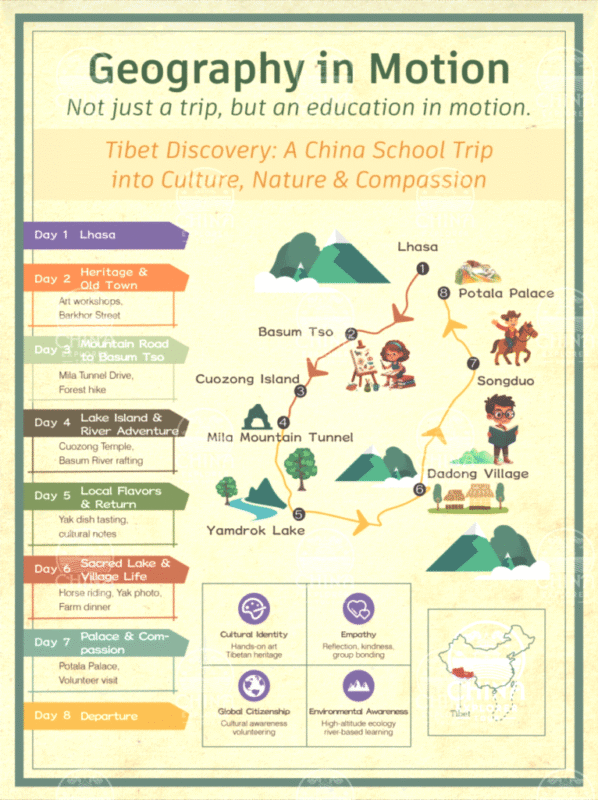 This is more than a school trip—it’s a journey into the heart of Tibet, where ancient traditions meet snow-capped mountains and spiritual wisdom flows through every valley. Over 8 days, students will explore Tibetan heritage, participate in hands-on craft-making, visit UNESCO sites, connect with local children, and reflect on sustainability and compassion at high altitude.